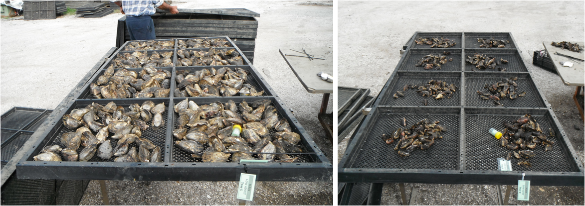 In all cultivation systems (trays, long lines, floating), the mortality rate will be recorded fortnightly before the expected POMS outbreak, and then at appropriate intervals during and after the outbreak. Additionally, the spatial pattern of mortality observed between and within trays/baskets last summer (2011/2012) gave some insight into the virus distribution in the water column. Therefore, detailed location and orientation of trays and baskets (individually numbered) within the lease will be recorded at the beginning of the trial and will be conserved throughout the experiment in order to detect directional transmission/progression of POMS disease. Such a rigorous approach should help our understanding of POMS virus behaviour in natural aquatic systems. Growth rate will be measured fortnightly by assessing length, width, depth and total weight of randomly selected oysters. POMS virus will be detected and quantified by qPCR to assess the disease intensity and prevalence among treatments in each site at different intervals before/during/after the outbreak.