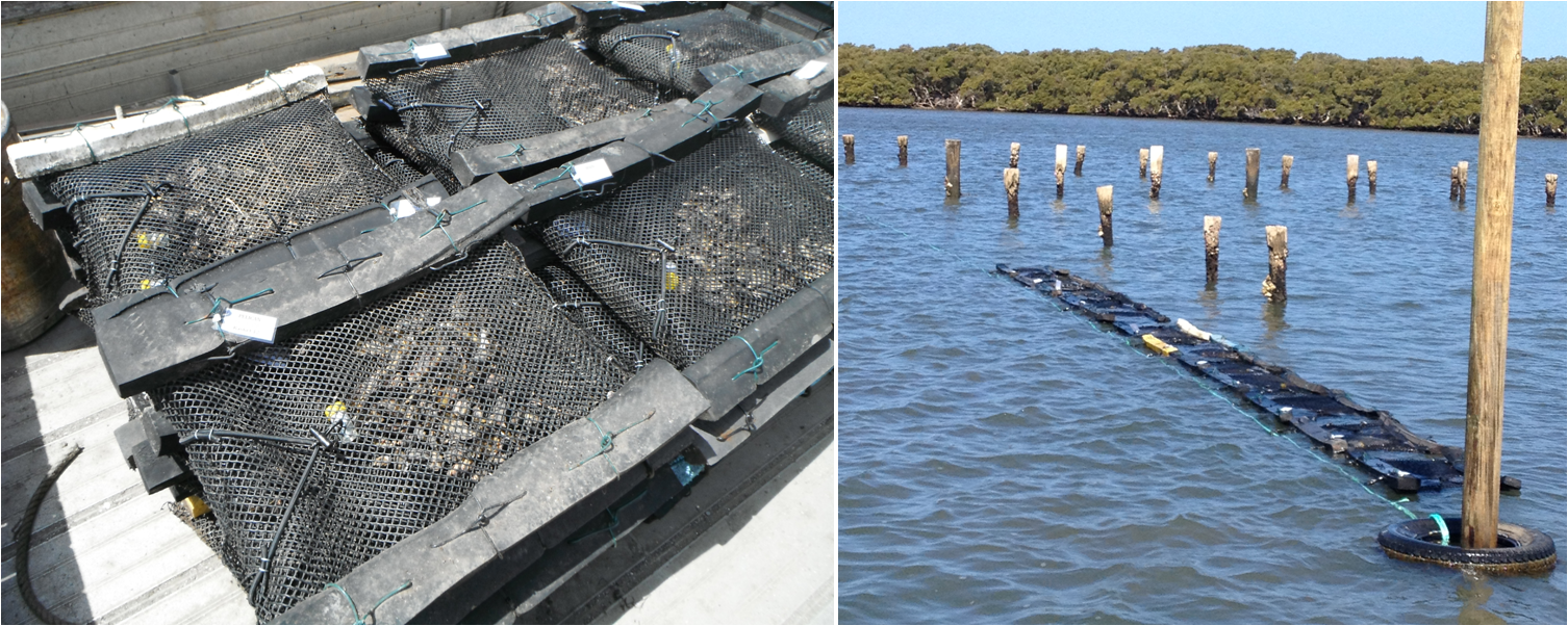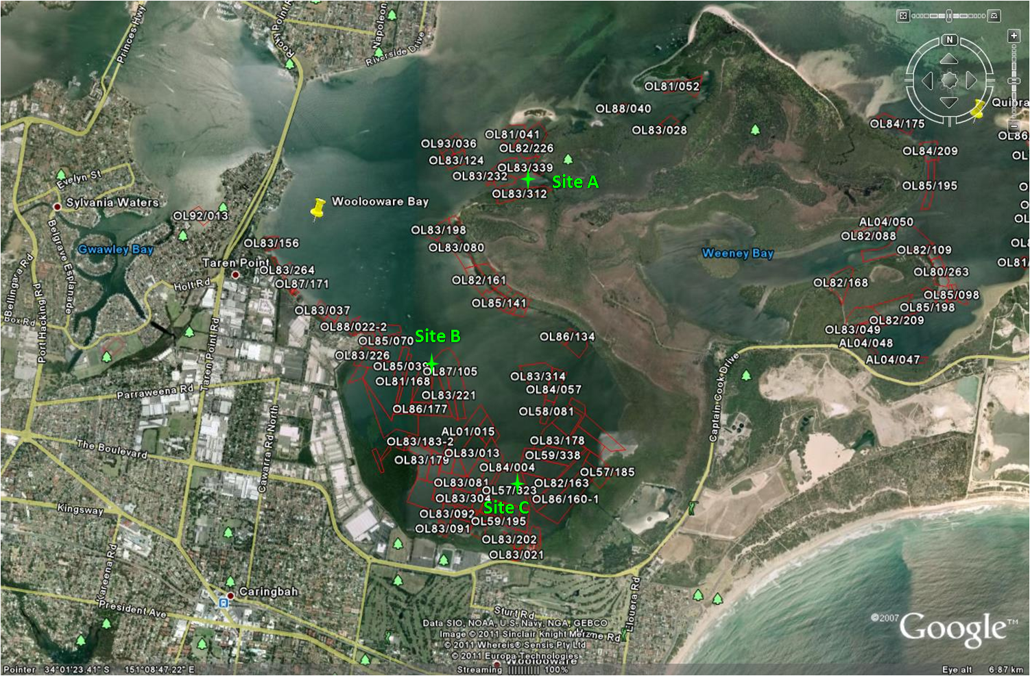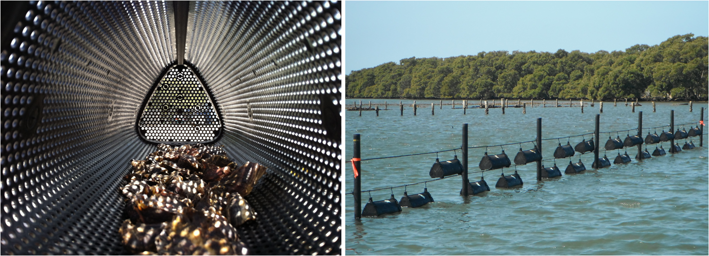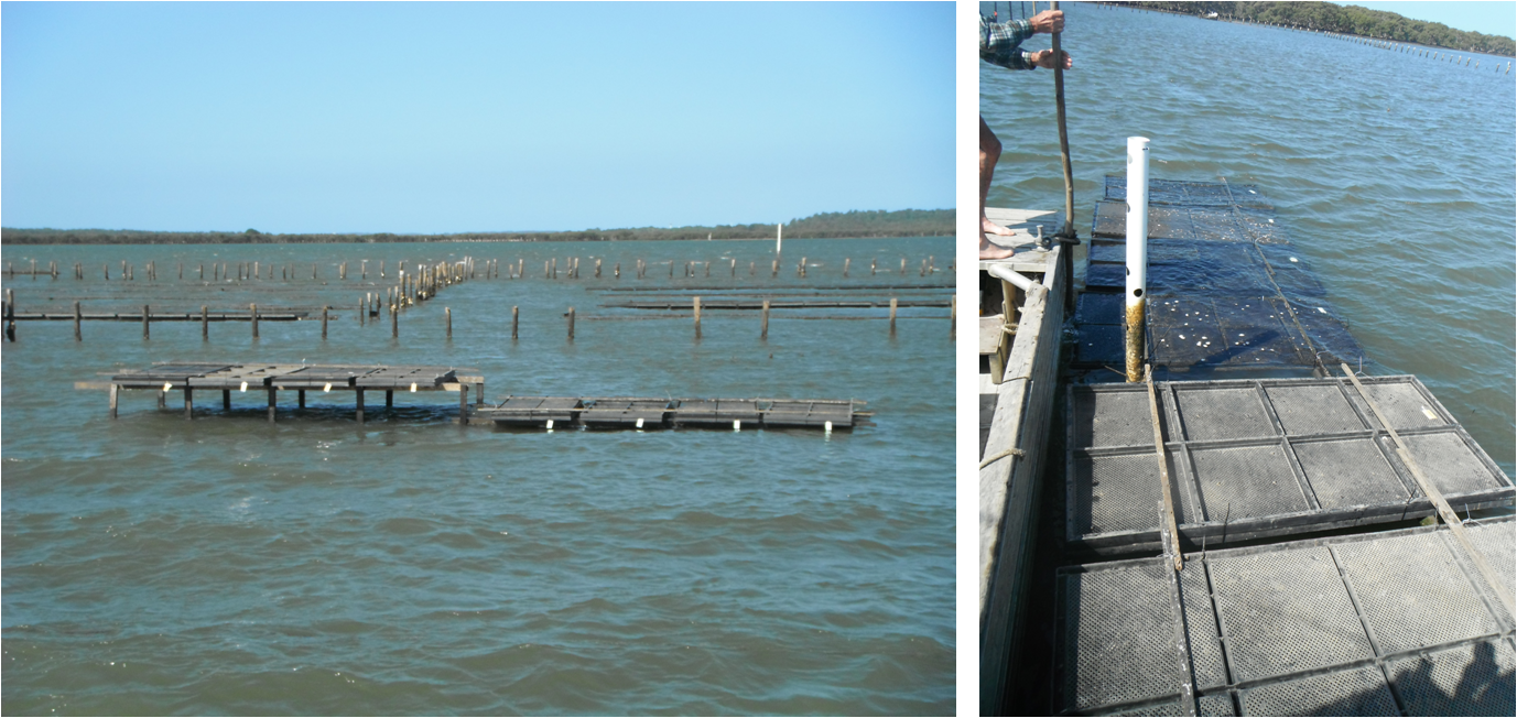 – Our oyster grower partners John Stubbs, Bruce Alford and Rob Moxham (Broken Bay Oysters); Len, Ted and Bob Drake (Endeavour Oysters Pty Ltd); Bob Hill and Keith Duggan (Endeavour Oysters Pty Ltd). We sincerely thank them for having spent so much of their own time and energy to set up the long line systems in Woolooware Bay, to provide floating baskets and the adult oysters required for this experiment, and for helping us each day in the field.