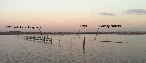 BST baskets placed on long lines fixed on Woodshield posts. Oysters placed at H2 and H3 experience different immersion times.
